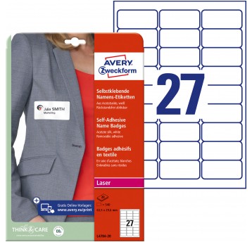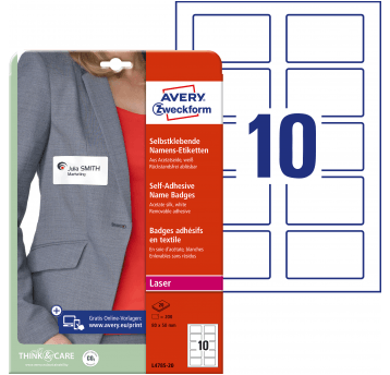 Samoprzylepne identyfikatory Avery do zadruku, A4, 20 ark./op., 80 x 50 mm, białe, sztuczny jedwab