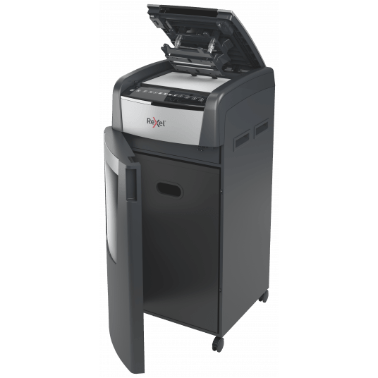 - Wyposażona jest w automatyczny podajnik i 140-litrowy pojemnik na ścinki, co sprawia, że idealnie nadaje się do użytku biurowego