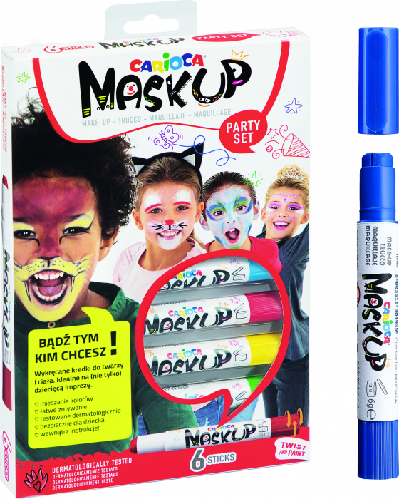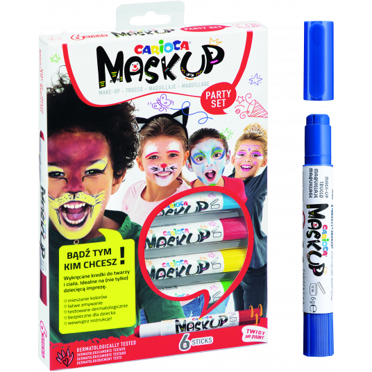 – wykręcane kredki do twarzy i ciała – łatwo się rozprowadzają – nie brudzą rąk – łatwo zmywalne ze skóry za pomocą wody z mydłem, spieralne z tkanin – kolory łatwo mieszają się ze sobą – bezpieczne dla skóry dziecka – produkt testowany dermatologicznie – zestaw 6 intensywnych kolorów x 6 g – wewnątrz instrukcje!