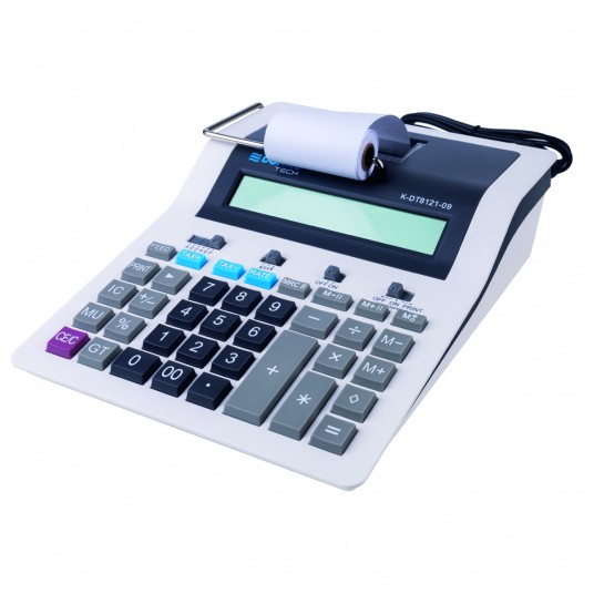 Kalkulator drukujący Kolor: Biały; Wymiary: 267mm x 202mm x 77mm; Zasilanie: Bateria; Szerokość papieru: 58mm; Drukowanie w dwóch kolorach: niebiesko–czerwonym; Posiada 12cyfrowy wyświetlacz; Wyłącza się automatycznie.