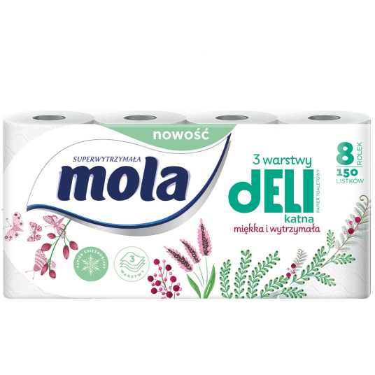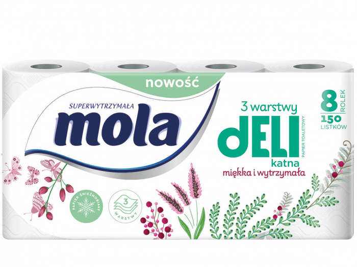 Mola Delikatna Biała to aż 3 wytrzymałe warstwy wysokiej jakości białego papieru toaletowego i 150 ekstra delikatnych listków. Każda rolka posiada wyjątkowe tłoczenie w kształcie miękkich poduszeczek, dzięki czemu Mola Delikatna jest jeszcze bardziej przyjazna dla wrażliwej skóry - zarówno Twojej, jak i Twojego dziecka.