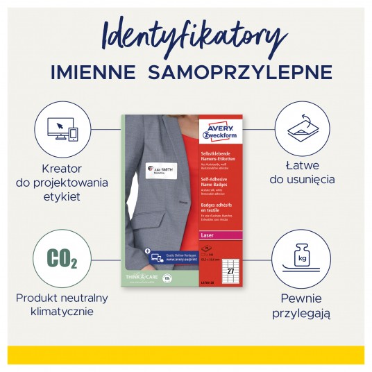 • Produkcja identyfikatorów Avery Zweckform jest neutralna pod względem emisji CO2 (certyfikat Focus Future) i zgodna ze standardem ISO14001, który pomaga zminimalizować negatywne czynniki oddziałujące na środowisko naturalne.