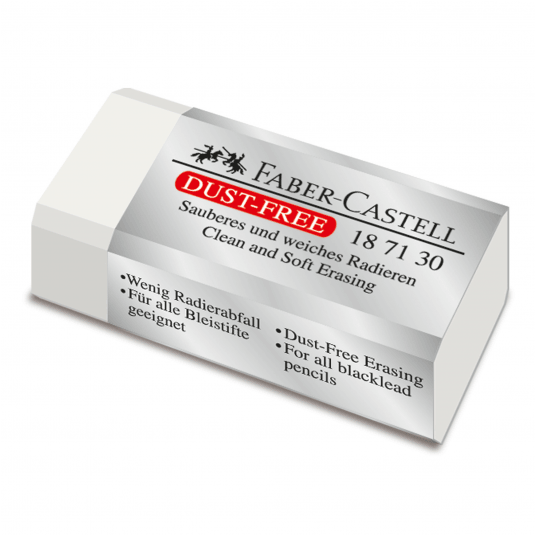 Gumka do wymazywania Dust Free Faber-Castell w ochronnym opakowaniu. Zrównoważone połączenie tworzyw sztucznych powoduje, że wymazywanie nie zostawia smug. Minimalna ilość ścinków, które łatwo się zwijają, co ułatwia czyszczenie. Odpowiednia do grafitowych ołówków i kredek. Czarny kolor nie pozostawia zabrudzeń. Przetestowana i zatwierdzona dermatologicznie.