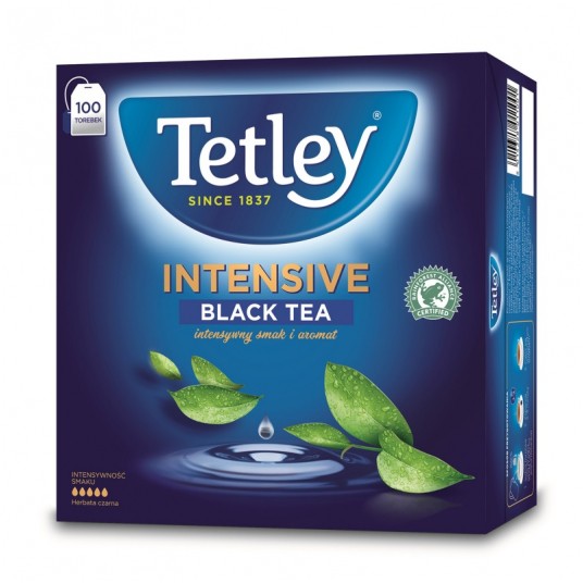Tetley Intensive to wysokiej jakości kompozycja czarnych herbat z Kenii oraz Indyjskich herbat Assam, które tworzą wyjątkowe połączenie, dając szlachetny napar o intensywnym smaku i aromacie herbata pakowana w Indiach w opakowaniu 100 torebek z zawieszką