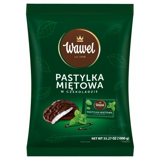 pastylki w czekoladzie z charakterystycznym, mocno miętowym nadzieniem